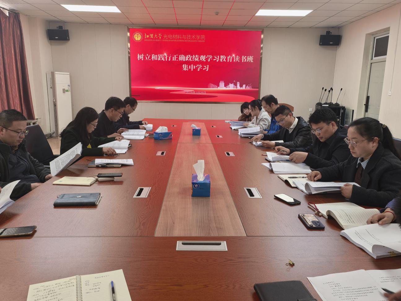 根据上级党委工作要求,光电学院党委采取集中学习、个人自学和交流研讨相结合的方式,举办了树立和践行正确政绩观学习教育读书班。3月26日,读书班开展集中学习,院党委书记吴云龙主持并领学《习近平关于树立和践行正确政绩观论述摘编》、习近平总书记2022年、2024年在湖北考察时的重要讲话精神,院党委副书记孙凯领学《习近平总书记地方工作期间坚持正确政绩观生动实践》。学院全体班子成员、全体支部书记参加学习。